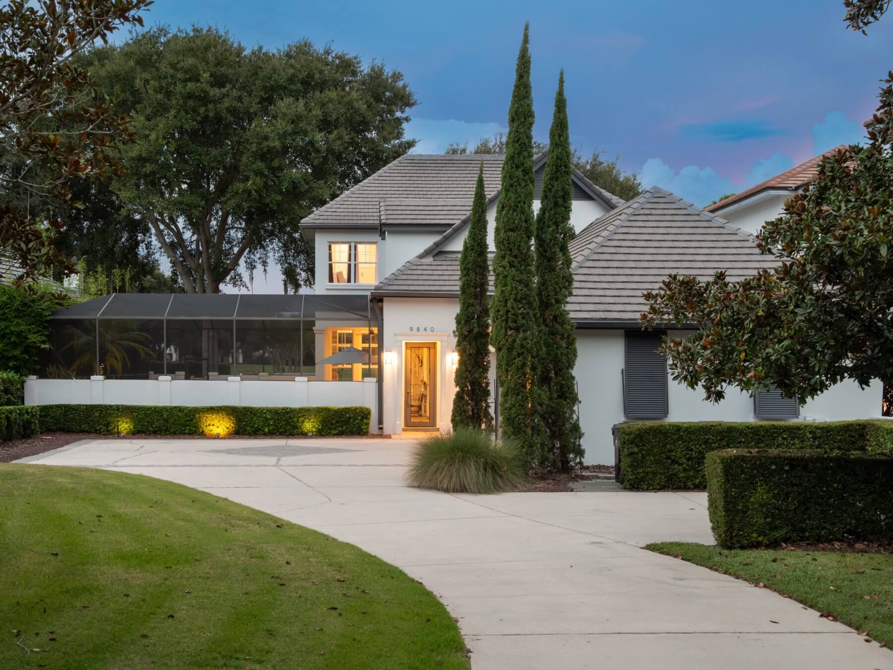 This private, tucked-away residence is perfectly located on the front nine of Lake Nona Golf & Country Club’s championship golf course. Thoughtful upgrades, an abundance of light-filled spaces, and sensational sunset views distinguish this beautiful courtyard home. An expansive front yard, with mature landscaping and winding driveway, welcomes you into the screen-enclosed courtyard with a serene saltwater, heated pool and spa.